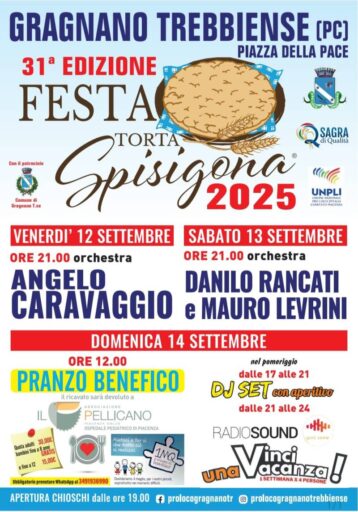 Festa della Torta Spisigona 2025 a Gragnano Trebbiense dal 12 al 14 settembre. Una sagra di qualità con stand gastronomici, ballo liscio con le orchestre Angelo Caravaggio, Danilo Rancati e Mauro Levrini.