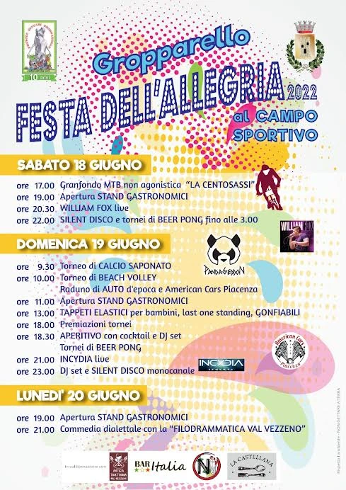 La Pro Loco Giovani Gropparello ritorna in pista con un evento che promette puro divertimento. Dal 18 al 20 giugno è in programma la Festa dell’Allegria, 3 giorni dedicati alla musica con i concerti live di William Fox, sabato alle 20,30 e Incydia Live di domenica alle 21. A seguire ci si potrà scatenare con la Silent Disco fino alle 3 del mattino.