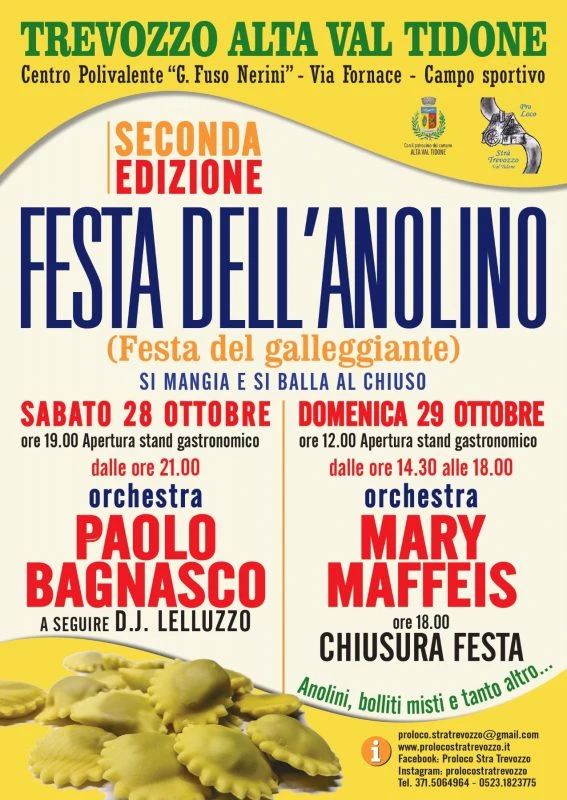 Sabato 28 e Domenica 29 Ottobre 2023 a Trevozzo (Alta Val Tidone, PC) sotto il tendone si balla e si mangia per la seconda edizione della Festa dell’Anolino. L’evento si tiene presso il campo sportivo e centro polivalente di Trevozzo Alta Val Tidone in via Fornace, sotto al tendone verde.