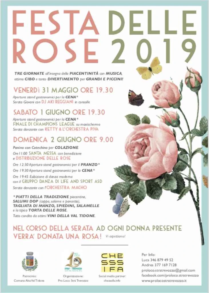 Festa delle Rose a Trevozzo Valtidone dal 31 maggio al 2 giugno. La Pro Loco Strà di Trevozzo apre la stagione degli eventi con la tradizionale “Festa delle Rose”. In particolare si tratta di tre serate all’insegna del divertimento e dell’enogastronomia. Durante l’evento si spazierà tra musica e stand gastronomici con piatti tipici piacentini. Soprattutto si potranno gustare pisarei e fasö, tagliata di manzo, salamelle, spiedini. Inoltre non mancheranno: coppa, salame e pancetta e ottimi vini della Val Tidone.