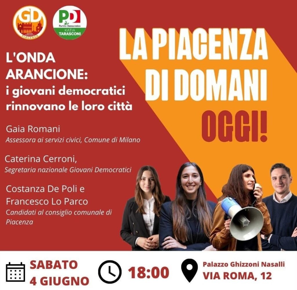 Siamo quasi giunti al termine della nostra campagna elettorale! Negli ultimi mesi siamo andati strada per strada ad ascoltare le esigenze dei cittadini e a presentare la nostra visione di una città più giovane alla quale stiamo lavorando dalla nascita della nostra Federazione Provinciale avvenuta ormai due anni fa. Per chiudere questa bellissima esperienza a sostegno di Katia Tarasconi Sindaco, vogliamo mostrare, con il nostro evento di chiusura che, come Giovani Democratici, non siamo stati gli unici. In tutt’Italia ragazze e ragazzi come noi, aderenti alla nostra federazione giovanile, si sono fatti avanti per rinnovare le loro città. In tanti sono stati eletti, in comuni grandi e piccoli, spesso con numeri alti di preferenze, costituendo una vera e propria “onda arancione”. Vi aspettiamo per raccontarci come vorresti rinnovare Piacenza e per mostrarvi come abbiamo e come vorremmo, ancora di più portare, con l’eventuale impegno in Consiglio Comunale, l’onda arancione nella nostra città!