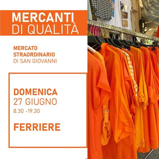 Festa di San Giovanni, a Ferriere il 27 giugno con i Mercanti di Qualità. I banchi della nota associazione spaziano su tutti i generi. In particolare si potrà trovare abbigliamento firmato, calzature, accessori moda, intimo e biancheria, fiori e piante, enogastronomia con specialità del territorio, oggettistica e tanto altro. Grazie ai prodotti made in Italy, domenica 27 giugno dalle 8 30 alle 19 30, sarà possibile passare una giornata di shopping di qualità in totale sicurezza.