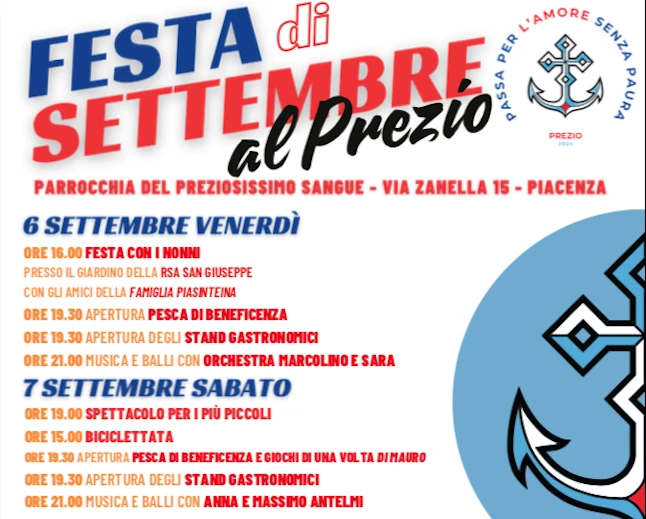 Festa di Settembre 2024 della Parrocchia del Preziosissimo Sangue dal 6 all’8 settembre 2024. A Piacenza in via Zanella sono previsti tre giorni di grande divertimento.