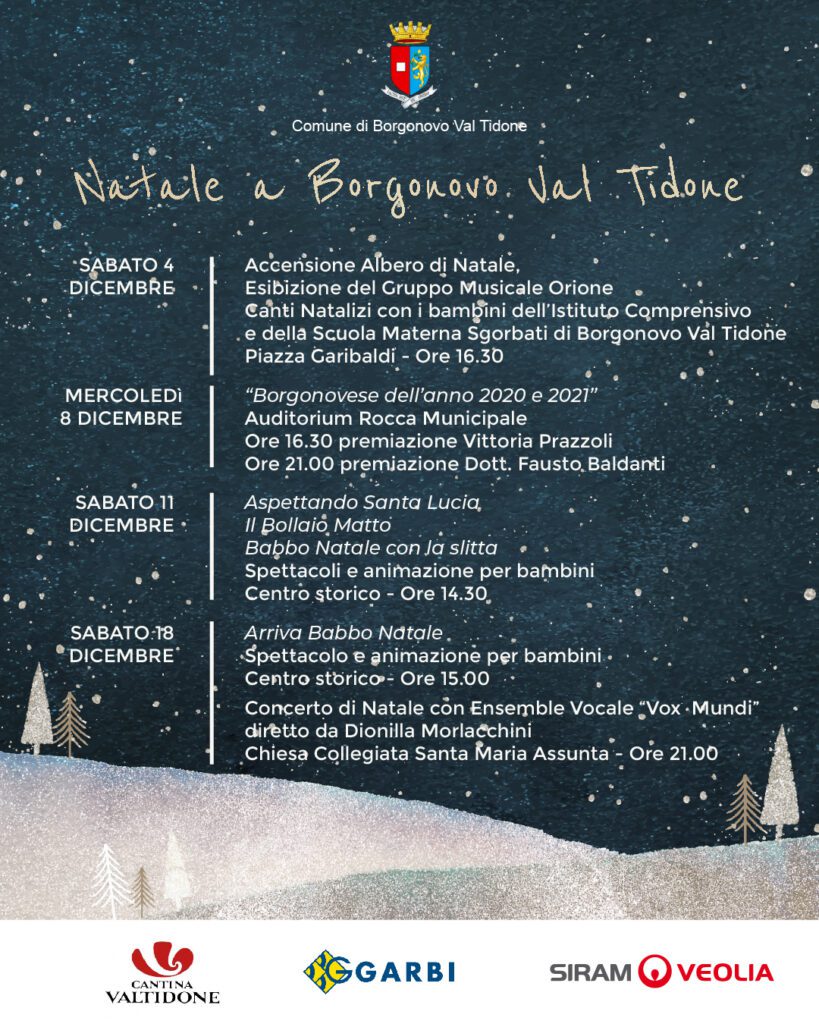 Si comincia sabato 4 dicembre con l’accensione dell’Albero di Natale in piazza, ai piedi della Rocca municipale. Il tradizionale appuntamento sarà allietato dall’esibizione del Gruppo musicale Orione e dai canti natalizi delle scuole di Borgonovo.