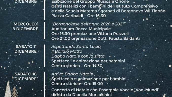 Sabato 18 dicembre sarà poi dedicato all’arrivo di Babbo Natale, protagonista di uno spettacolo e di vari momenti di animazione ai quali farà seguito, nella cornice della Chiesa Collegiata di Santa Maria Assunta nel cuore di Borgonovo, un concerto dell’Ensemble Vocale “Vox Mundi” diretto da Dionilla Morlacchini.