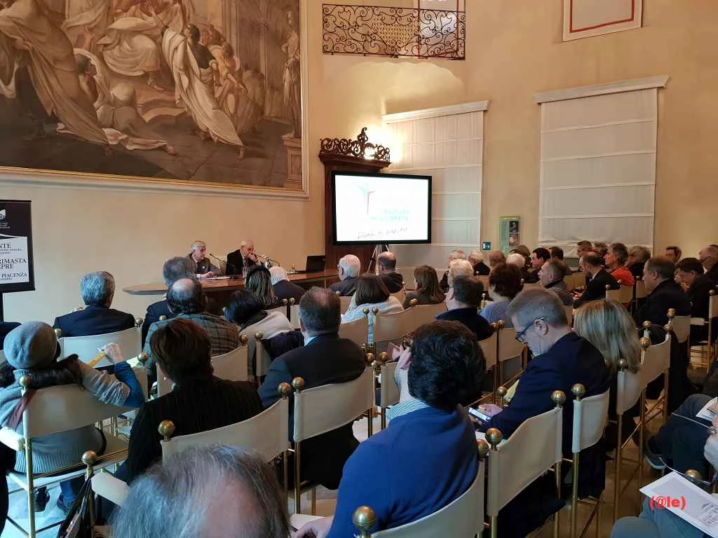 Il professor Forte ha sottolineato come sia stato particolarmente significativo che si sia discusso di proprietà e sviluppo capitalistico a Piacenza, dove si è sviluppata la più antica e importante forma di banca del mondo, la Fiera del cambio. Un passaggio che non è sfuggito a Corrado Sforza Fogliani, che ha ringraziato l’economista «di questa sua immensa cultura» che gli ha consentito di citare un particolare che pochi conoscono. A Piacenza, crocevia dei percorsi dei pellegrini per raggiungere Roma, nacque infatti il primo cambia valute, in piazza Borgo (nelle vicinanze sorgeranno, a seguire, il monte dei pegni e la Cassa di risparmio). E i piacentini, da pellegrini e mercanti, si trasformarono in banchieri.
