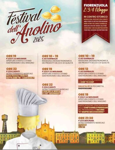 Fiorenzuola celebra il gusto: torna il Festival dell’Anolino dal 2 al 4 maggio 2025. Un’esplosione di sapori, tradizione e divertimento animerà il centro storico di Fiorenzuola d’Arda dal 2 al 4 maggio 2025 con l’attesissimo ritorno del Festival dell’Anolino, manifestazione che celebra uno dei simboli gastronomici più amati del territorio piacentino: l’anolino. La kermesse culinaria, che si svolgerà tra Piazza F.lli Molinari, Corso Garibaldi e Piazza Caduti, promette un weekend ricco di eventi, showcooking, musica e naturalmente ottimo cibo.