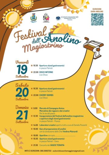 Il Festival dell’Anolino Magiostrino 2025 ritornerà a Cortemaggiore nelle giornate di venerdì 19, sabato 20 e domenica 21 settembre 2025. Sarà un weekend dedicato alla tradizione, ai sapori autentici e alla convivialità del territorio.