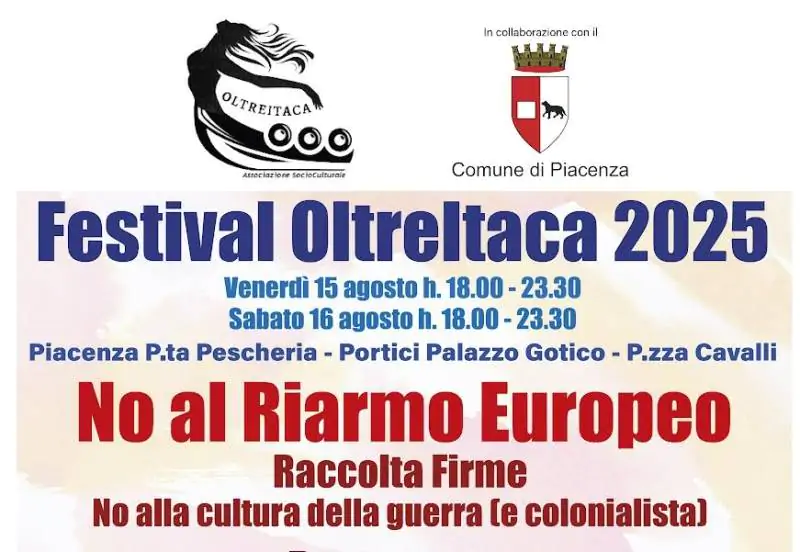 Su iniziativa dell’ Associazione socio-culturale Oltreitaca , in collaborazione con il Comune di Piacenza e l’adesione dell’Associazione Nel Nuovo Mondo Spazio Tesla, Comitato 15 Ottobre e Associazione Igienista italiana , Venerdì 15 Giovedì Agosto e Sabato 16 Agosto dalle 18 alle 23,30 in Piacenza P.ta Pescheria e sotto I portici del Palazzo Gotico avrà luogo il Festival di Oltreitaca “NO AL RIARMO EUROPEO- NO ALLA CULTURA DELA GUERRA ( E COLONIALISTA)”