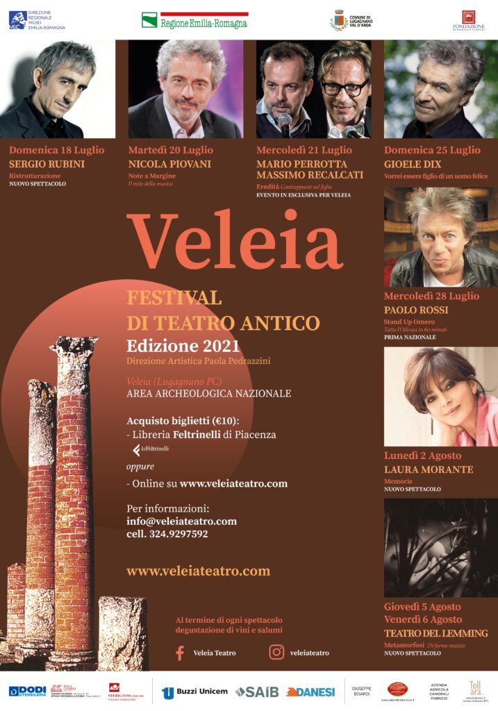 “Un cartellone d’eccezione composto da appuntamenti preziosi, creati appositamente e in esclusiva per Veleia (la performance inedita di Massimo Recalcati e Mario Perrotta), che scelgono il festival per il loro debutto in prima nazionale (Paolo Rossi e Laura Morante) o che vi approdano in una versione speciale (il nuovo spettacolo di Sergio Rubini)”.