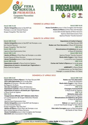 Fiera Agricola di Primavera è tutto pronto a Carpaneto Piacentino per l’edizione 2025. Evento presentato dal sindaco Andrea Arfani così: “Con grande orgoglio e profondo senso di gratitudine, ci apprestiamo a vivere insieme uno degli appuntamenti più sentiti e partecipati del nostro territorio: la nostra storica Fiera Agricola di Primavera, giunta alla sua 347ª edizione”. L’evento è previsto per il 25, 26 e 27 aprile 2025, e l’inaugurazione per domenica 27 aprile alle 10, in Piazza XX Settembre.