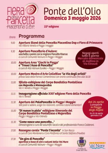 Fiera della Pancetta Piacentina Dop 2026 a Ponte dell’Olio il 3 maggio. La 22esima edizione sarà ricca di pancetteria d’Autore, stand, degustazioni, shopping, musica e tanto altro.