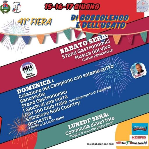 Fiera dell’usato di Gossolengo, giunta alla 41° edizione promossa dal Comune, i Mercanti di Qualità e dalla Pro Loco di Gossolengo. Tre giorni per tutta la famiglia a base di specialità gastronomiche a chilometro zero, birre artigianali musica. Sabato 15 giugno maxi schermo per seguire Italia- Albania, domenica 16 giugno dal mattino con i Mercanti di Qualità e la Fiera dell’Usato e lunedì 17 giugno la commedia dialettale