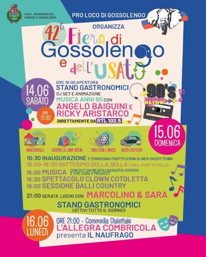 Fiera di Gossolengo e dell’Usato dal 14 al 16 Giugno. La Pro Loco di Gossolengo, con il patrocinio del Comune di Gossolengo, propone 3 giorni di festa, buon cibo e divertimento per tutti. L’evento è giunto alla 42esima edizione.