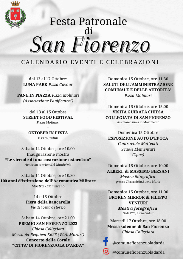 Diversi inoltre gli eventi collaterali in calendario: sabato 14 ottobre, alle 10 sarà inaugurata in Municipio la mostra “Le vicende di una costruzione ostacolata” – visitabile sino all’11 novembre ed incentrata sulla realizzazione del monumento ai Caduti – mentre alle 10.30 sarà la volta della mostra dedicata ai cento anni dall’istituzione dell’Aeronautica militare, all’interno dell’ex macello, e visitabile nelle giornate di sabato 14 e domenica 15 ottobre. Nella stessa giornata, alle 21, in Collegiata si terrà la Cerimonia di conferimento del Premio San Fiorenzo 2023 (assegnato quest’anno a Daniele Bruschi), all’interno del tradizionale concerto della Corale “Città di Fiorenzuola d’Arda”, che proporrà la “Messa da Requiem” di Mozart. Nella giornata di domenica 15 ottobre, saranno visitabili le due mostre fotografiche “Alberi” di Massimo Bersani, nella chiesa della Buona Morte, e “Broken Mirror” di Fiippo Venturi, nella sede del Club Cinefotografico; alle 11.30 avrà luogo il saluto dell’Amministrazione comunale e delle Autorità in Piazza Molinari, mentre alle 15.20 l’associazione Fiorenzuola in Movimento proporrà la visita guidata alla Collegiata. Per tutta la giornata saranno inoltre in esposizione auto d’epoca, in viale Matteotti. Chiuderà il calendario di eventi, alle 18 di martedì 17 ottobre (giornata in cui si celebra la Memoria di San Fiorenzo), la Messa solenne in Collegiata.