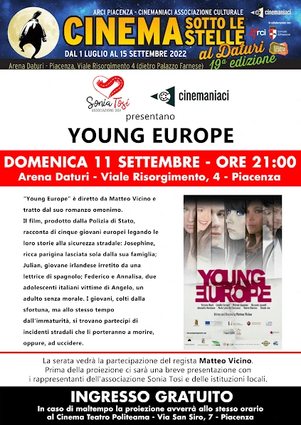 Domenica 11 settembre , in collaborazione con Cinemaniaci si terrà all’arena Daturi la proiezione del film Young Europe prodotto dalla Polizia di Stato con la presenza del regista Matteo Vicino, l’inizio è previsto per le ore 21.