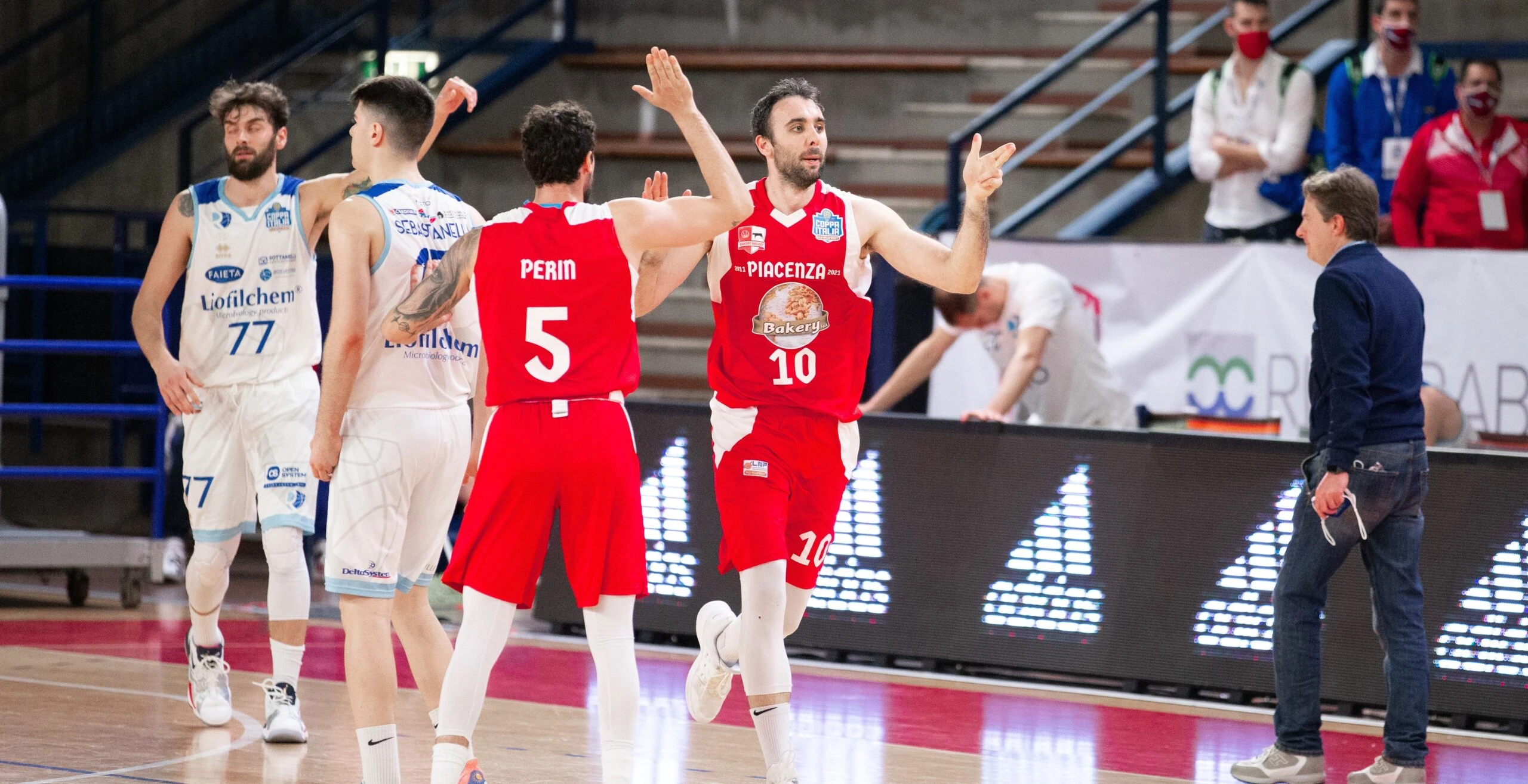 Negli ultimi dieci minuti del match accade di tutto, creando un finale thriller non adatto ai deboli di cuore. Birindelli apre le marcature su assist di Vico, ma dall’altra parte Lucarelli infila due triple consecutive e il successivo tap-in sotto canestro che vale il parziale di 8-0 che costringe Campanella alla pausa sul punteggio di 55-54. Nikolic infila il +1, e ancora una volta Lucarelli trova il bersaglio grosso dall’arco: 59-55. La Bakery Piacenza deve reagire, e lo fa, prima con Sacchettini e poi con la magica tripla di Perin dopo progressione centrale. Le due squadre viaggiano sul filo del rasoio e qui arriva Vico con un tiro dall’angolo che pesca il 63-61 biancorosso, seguito a ruota da altri tre punti di Planezio.