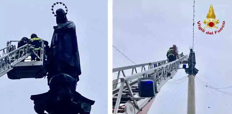 I vigili del fuoco tengono viva la tradizione dell’Immacolata e come ogni 8 dicembre hanno depositato una corona di fiori tra le mani della statua della Madonna in piazza Duomo. Come ogni anno un’operazione significativa ed emozionante, anche perché, come noto, la statua si trova in cima alla colonna monumentale, a circa 20 metri d’altezza. I pompieri hanno raggiunto la scultura attraverso un’autoscala davanti agli occhi ammirati dei passanti.