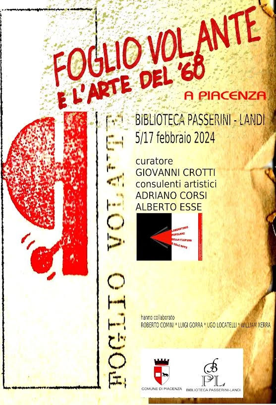 Lunedì 5 febbraio 2024 alle ore 17:00 inaugurazione della Mostra “FOGLIO VOLANTE e l’arte del ’68 a Piacenza”, organizzata dal Laboratorio Popolare della Cultura e dell’Arte di Piacenza, curata da Giovanni Crotti con la consulenza artistica di Adriano Corsi e Alberto Esse. La mostra ospitata presso i locali della Biblioteca Passerini – Landi. sarà visibile fino a Sabato 17 febbraio ed osserverà gli orari di apertura della Biblioteca. Sono previste visite organizzate in particolare rivolte alle scuole.