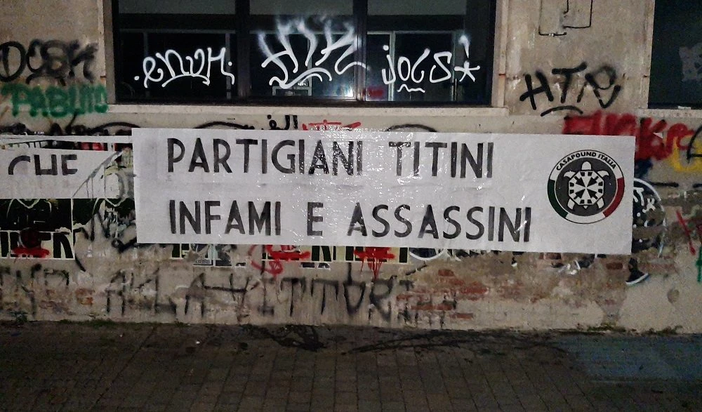 “Partigiani titini infami e assassini”: è questo il testo dello lo striscione apparso in oltre cento città italiane in occasione del Giorno del Ricordo, affiancato dalla ‘tartaruga frecciata’ simbolo di CasaPound Italia.