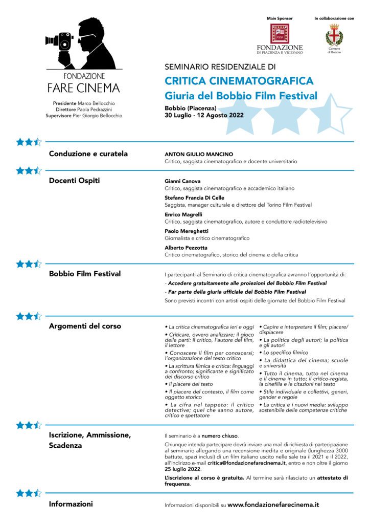 Fondazione Fare Cinema presieduta da Marco Bellocchio e diretta da Paola Pedrazzini, organizza la XIIa edizione del Seminario Residenziale di Critica Cinematografica.