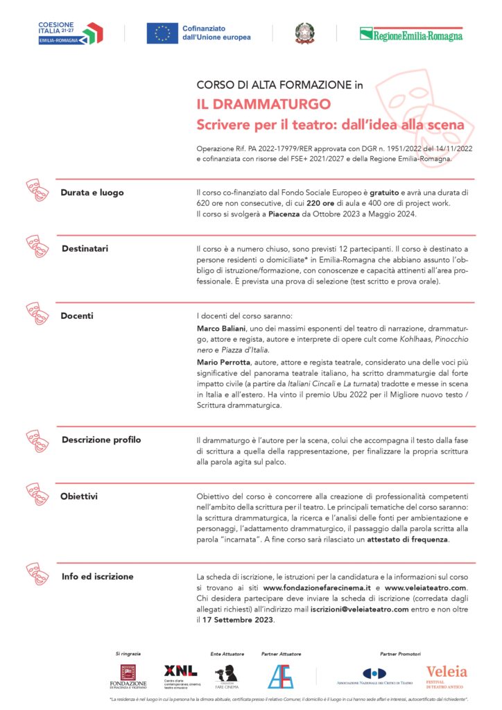 “Il drammaturgo – Scrivere per il teatro: dall’idea alla scena” è un percorso formativo rivolto a residenti o domiciliati in Emilia-Romagna che abbiano assunto l’obbligo di istruzione/formazione, con conoscenze e capacità attinenti all’area professionale.