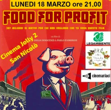 “Food For Profit” a Piacenza, proiezione il 18 marzo al cinema Jolly, una collaborazione tra Cinema jolly e le associazioni Cinemaniaci, Legambiente e Veg & Joy .