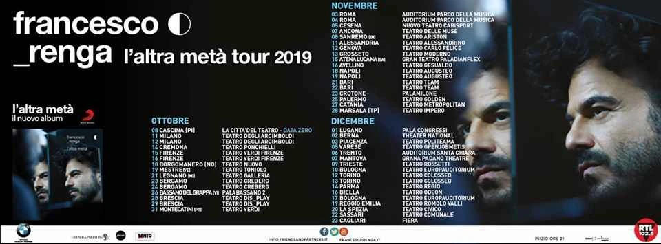Martedì 3 dicembre sul palco del Teatro Politeama arriva FRANCESCO RENGA, col suo nuovo l’altra metà tour. Si tratta di uno dei più apprezzati cantautori, dell’ultima generazione, della musica italiana. Dopo i successi con i Timoria, Francesco Renga ha proseguito la sua carriera da solista vincendo un Festival di Sanremo e con album sempre apprezzati dal pubblico.