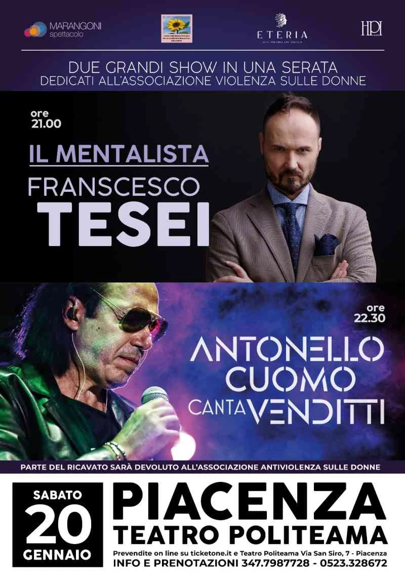 Doppio spettacolo con Francesco Tesei e Antonello Cuomo in programma sabato 20 gennaio al Teatro Politeama di Piacenza. Due grandi show in un’unica serata dedicata al Centro Anti Violenza di Piacenza.