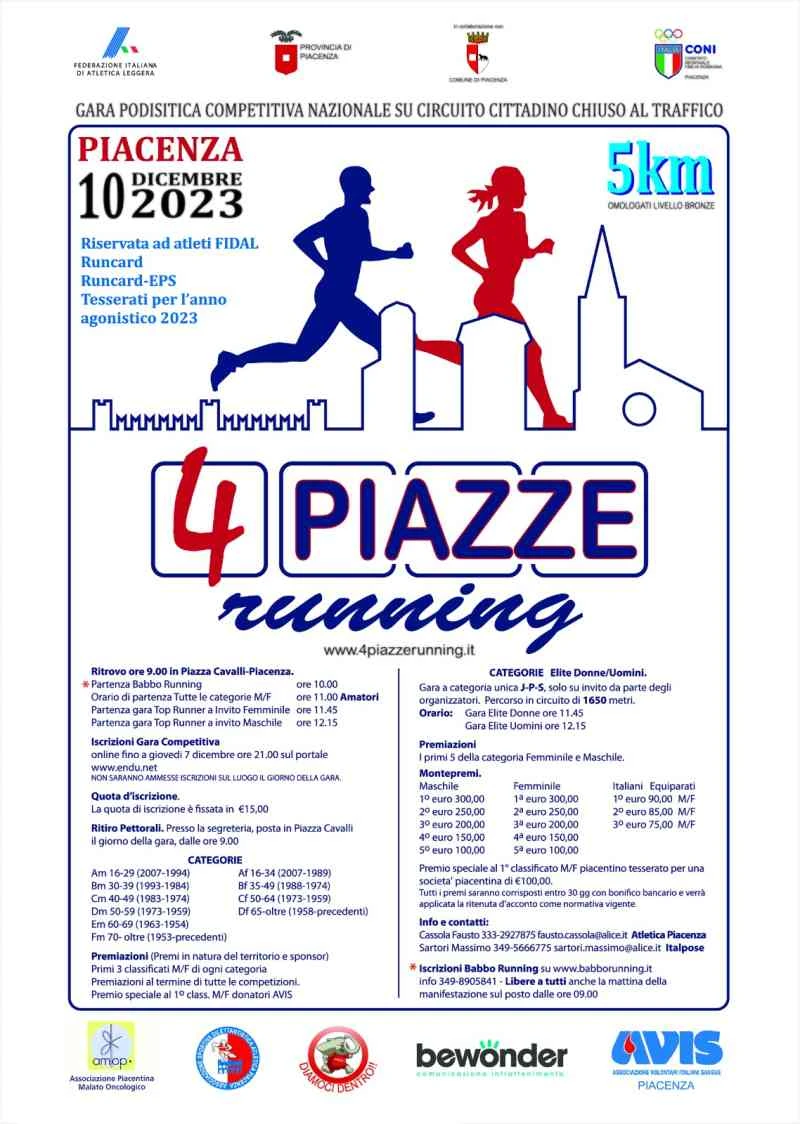 E’ ancora possibile, sino alle 21 di giovedì 7 dicembre, iscriversi alla sezione competitiva della gara podistica “4 Piazze Running”, circuito di 5 km riservato ad atleti tesserati Fidal di varie categorie, valevole come ultima prova del Tour delle Valli Piacentine 2023, che si snoderà nel cuore del centro storico nella mattinata di domenica 10 dicembre: il riferimento è il portale web www.endu.net.