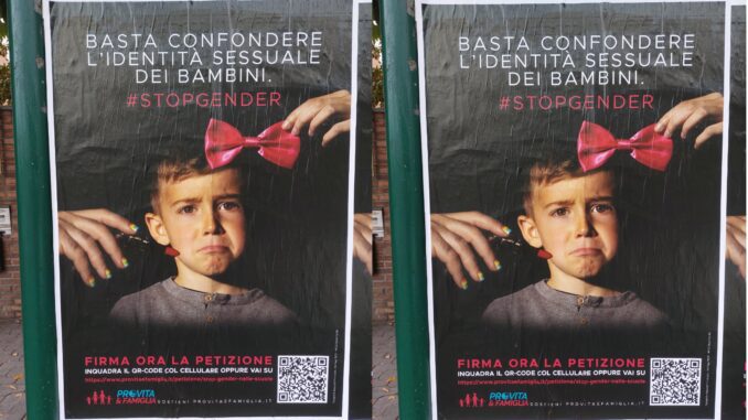 “In via IV Novembre a Piacenza sono stati affissi questi vergognosi manifesti, che gridano ad una presunta “ideologia gender” che i “collettivi omosessuali” vorrebbero instillare nei giovani, tramite un “lavaggio del cervello” (virgolettati nel testo della petizione). La violenza dell’immagine ed il suo contenuto offensivo sono inaccettabili e illegali (l’art. 23 del codice della strada vieta i messaggi pubblicitari sessisti o violenti o stereotipi di genere offensivi)”. Con queste parole i consiglieri comunali di Piacenza Coraggiosa, Boris Infantino e Matteo Anelli, hanno presentato un’interpellanza urgente affinché i manifesti siano immediatamente rimossi. Si tratta di manifesti affissi dal movimento “Pro Vita & Famiglia Onlus” per promuovere una petizione contro quella che viene definita teoria “Gender”.