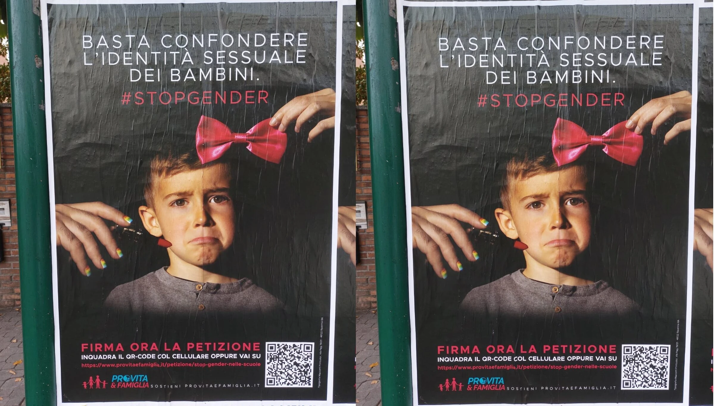 “In via IV Novembre a Piacenza sono stati affissi questi vergognosi manifesti, che gridano ad una presunta “ideologia gender” che i “collettivi omosessuali” vorrebbero instillare nei giovani, tramite un “lavaggio del cervello” (virgolettati nel testo della petizione). La violenza dell’immagine ed il suo contenuto offensivo sono inaccettabili e illegali (l’art. 23 del codice della strada vieta i messaggi pubblicitari sessisti o violenti o stereotipi di genere offensivi)”. Con queste parole i consiglieri comunali di Piacenza Coraggiosa, Boris Infantino e Matteo Anelli, hanno presentato un’interpellanza urgente affinché i manifesti siano immediatamente rimossi. Si tratta di manifesti affissi dal movimento “Pro Vita & Famiglia Onlus” per promuovere una petizione contro quella che viene definita teoria “Gender”.