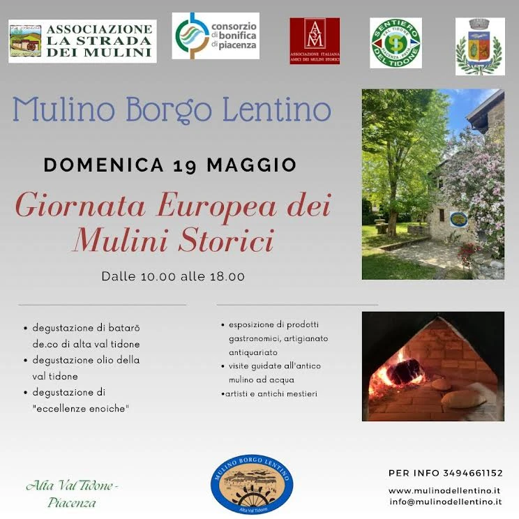 Domenica prossima 19 maggio torna la tradizionale manifestazione “Giornata europea dei mulini storici” a Borgo Mulino Lentino di Alta Val Tidone.