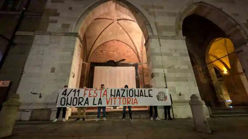 “Riteniamo un obbligo morale di tutti quello di ricordare il sacrificio e l’impegno militare dei nostri connazionali lungo il confine nord-orientale, dallo Stelvio agli altipiani d’Asiago, dalle Dolomiti all’Isonzo e fino al mare; fu la testimonianza di quel profondo sentimento di amor di Patria che animò i nostri soldati e gli italiani in quegli anni. In quegli anni l’Italia dimostrò di essere una Nazione e alimentò questo senso di appartenenza con la strenua resistenza sul Grappa e sul Piave, fino alle giornate di Vittorio Veneto; ed è proprio questa resistenza che noi ricordiamo ed onoriamo, e non quella tanto idolatrata il 25 aprile, che è una festa contro gli italiani del giorno prima, e che non rende onore al nemico ma nega dignità e memoria a tutti coloro che hanno dato la vita per la Patria, solo per la Patria, pur sapendo che si trattava di una guerra perduta”.