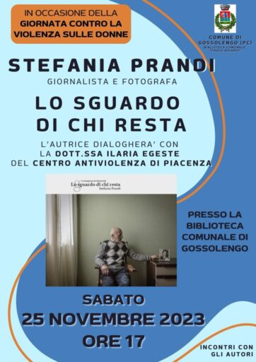 Giornata Internazionale contro la violenza sulle Donne, sabato 25 novembre 2023, alle ore 17, in occasione della Giornata Internazionale per l’eliminazione della violenza contro le Donne, presso la Biblioteca comunale “Paolo Boiardi” di Gossolengo in via XXV Aprile, 4 si terrà la presentazione del libro della giornalista e fotografa Stefania Prandi, “Lo sguardo di chi resta”.