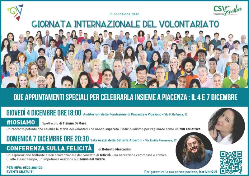Giornata Internazionale del Volontariato 2025, a Piacenza appuntamenti il 4 e 7 dicembre. Due eventi speciali per riflettere sull’importanza del “NOI” e sulla ricerca della felicità.