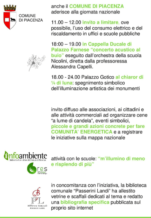 Anche il Comune di Piacenza aderisce alla giornata nazionale con numerose iniziative. Nella giornata di giovedì 16 febbraio sarà limitato, ove possibile, il consumo elettrico e il riscaldamento in uffici pubblici e nelle scuole. Alle 18, presso la Cappella Ducale di Palazzo Farnese si terrà il ‘Concerto acustico al buio’, eseguito dall’orchestra della scuola Nicolini. Sarà inoltre spenta, in modo simbolico, l’illuminazione artistica dei monumenti di Palazzo Gotico.
