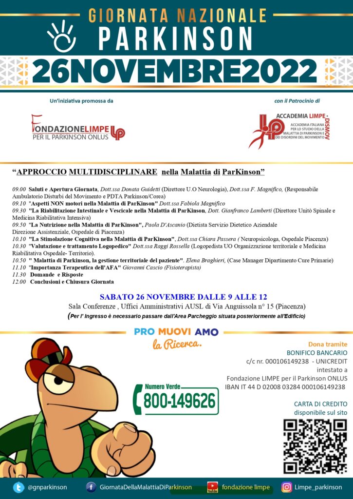 Anche quest’anno l’Azienda Usl di Piacenza rinnova il suo impegno per la Giornata nazionale Parkinson organizzando un incontro sul tema. La mattinata sarà dedicata a un confronto aperto tra professionisti sanitari, pazienti e familiari e si svolgerà sabato 26 novembre dalle 9 alle 12 alla sala conferenze della sede di via Anguissola 15. L’evento vede la partecipazione del team di specialisti del gruppo multidisciplinare che segue i malati di Parkinson.