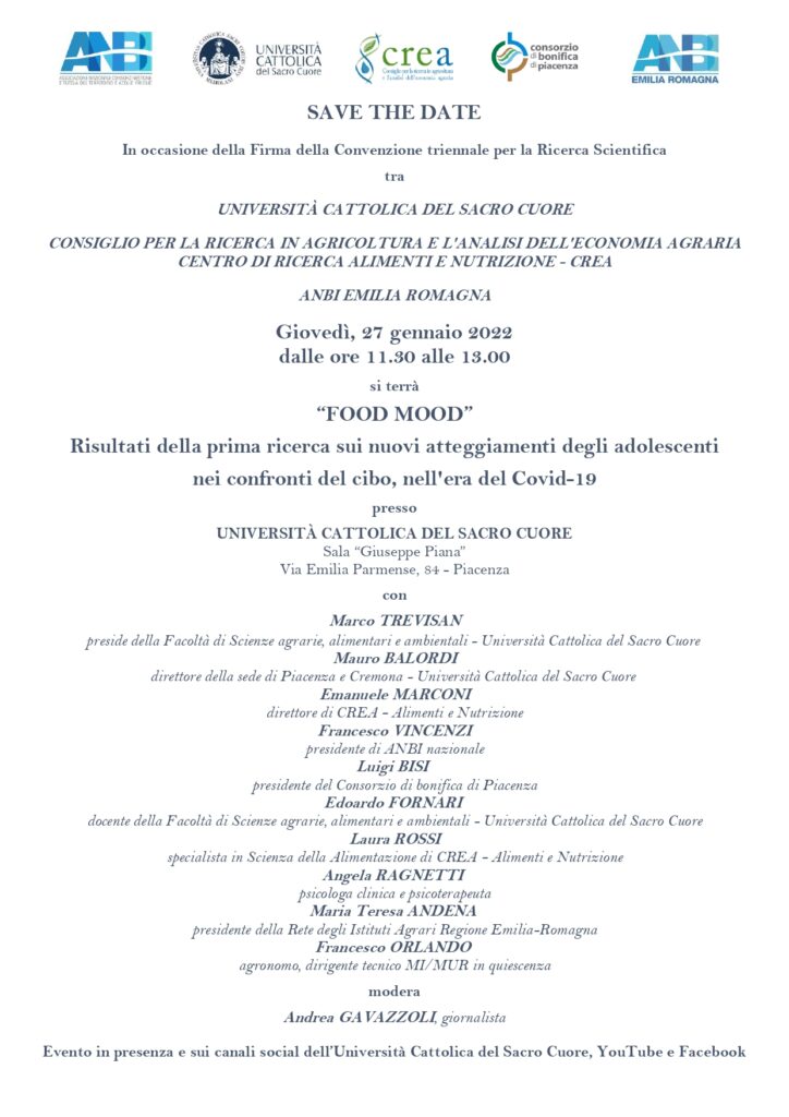 Dopo due anni di emergenza pandemica causata dal virus Covid 19 l’Università Cattolica del Sacro Cuore, l’ANBI, il CREA (Consiglio per la Ricerca in agricoltura e analisi dell’economia agraria – Ministero Politiche Agricole) e il Consorzio di Bonifica di Piacenza – in occasione dell’incontro di Firma della Convenzione triennale per la Ricerca Scientifica programmato presso la Sala G. Piana all’Università Cattolica in Via Emilia Parmense 84 a Piacenza il giorno GIOVEDI 27 GENNAIO alle 11,30 – presenterà in ANTEPRIMA NAZIONALE le risultanze dell’ approfondito monitoraggio ” FOOD MOOD – I NUOVI ATTEGGIAMENTI DEGLI ADOLESCENTI NEI CONFRONTI DEL CIBO NELL’ERA DEL COVID 19″.