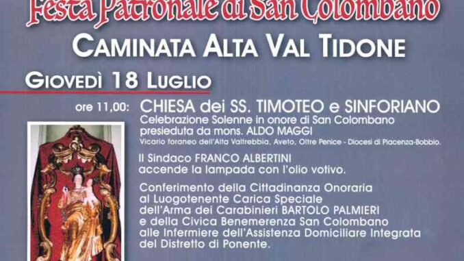 Ricorre giovedì 18 luglio il santo patrono del Comune di Alta Val Tidone, San Colombano, così come proclamato dall’Amministrazione al momento della fusione dei precedenti comuni di Nibbiano, Caminata e Pecorara, in ricordo e celebrazione di quello stesso giorno del 929 quando passò a Nibbiano l’arca contente il corpo del santo durante la traslazione della salma da Bobbio a Pavia e ritorno a Bobbio.