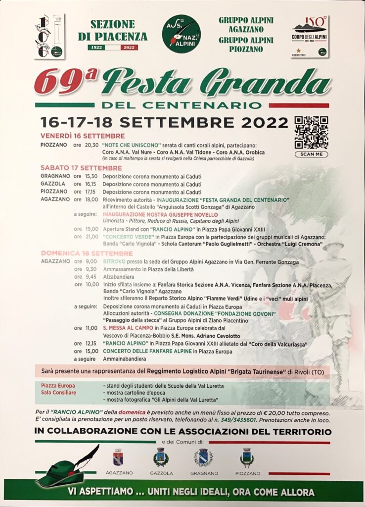 Le sezioni Alpini di Piacenza, Agazzano e Piozzano invitano tutti alla 69^ Festa Granda, edizione che coincide col Centenario della sezione piacentina, nata appunto nel 1922. Edizione che coinvolgerà i comuni di Agazzano, Piozzano, Gazzola e Gragnano. Un appuntamento dunque estremamente prestigioso per le penne nere della nostra provincia le quali, non a caso, hanno allestito un ricco programma da venerdì 16 a domenica 18 settembre.