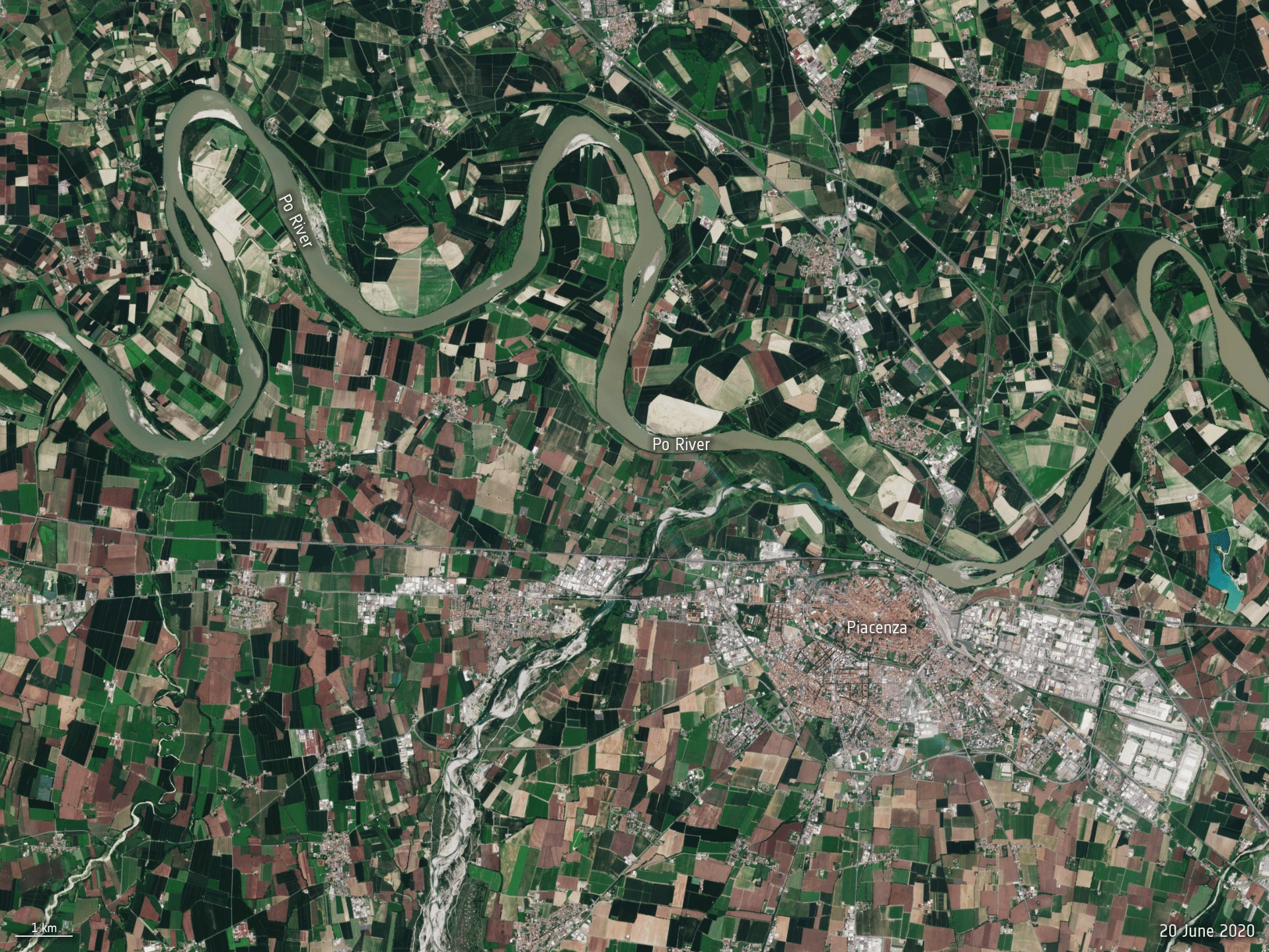 Normalmente, il fiume Po è un’ampia fascia di acque torbide (come si vede nell’immagine di giugno 2020), che tuttavia si è ora prosciugata rivelando grandi distese di sabbia (come nell’immagine di giugno 2022).