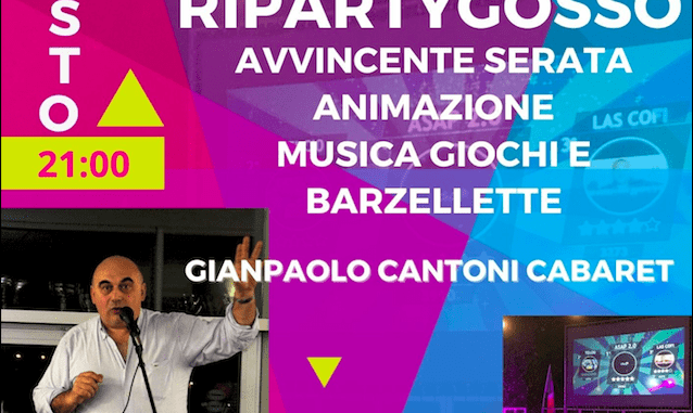 Gossolengo riparte da “RiPartyGosso” sabato 21 agosto. L’evento organizzato dal Comune di Gossolengo, previsto in Piazza Roma dalle ore 20, prevede musica e cabaret con Il comico barzellettiere Gianpaolo Cantoni e il Sound Quiz Show con Radio Sound. Inoltre non mancheranno i piatti gustosi preparati dalla Pro loco e dalla VacaLoca.
