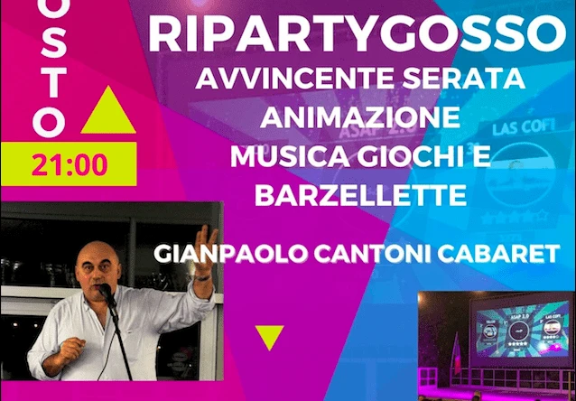 Gossolengo riparte da “RiPartyGosso” sabato 21 agosto. L’evento organizzato dal Comune di Gossolengo, previsto in Piazza Roma dalle ore 20, prevede musica e cabaret con Il comico barzellettiere Gianpaolo Cantoni e il Sound Quiz Show con Radio Sound. Inoltre non mancheranno i piatti gustosi preparati dalla Pro loco e dalla VacaLoca.