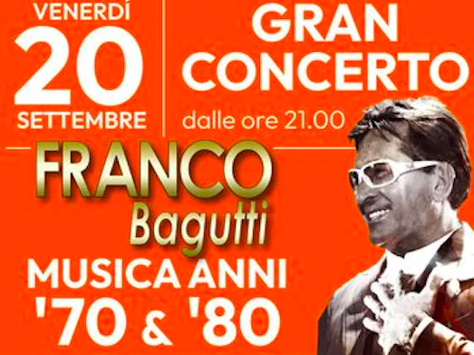 Gran Concerto di Franco Bagutti, un evento unico per festeggiare le nozze d’oro del re del liscio e non solo. L’appuntamento è fissato per Venerdi 20 settembre ad Alseno nel piazzale di Rossetti Market. Inizio alle ore 21. Per l’occasione l’artista con la sua grande band proporrà un repertorio che spazierà dagli anni 60′ ai 90′. Uno spettacolo irripetibile, a ingresso gratuito, per festeggiare i 50 anni di carriera del maestro Franco Bagutti. La serata inizierà alle ore 18.30 con stand gastronomico e cocktail bar. L‘appuntamento è organizzato da Rossetti Market.