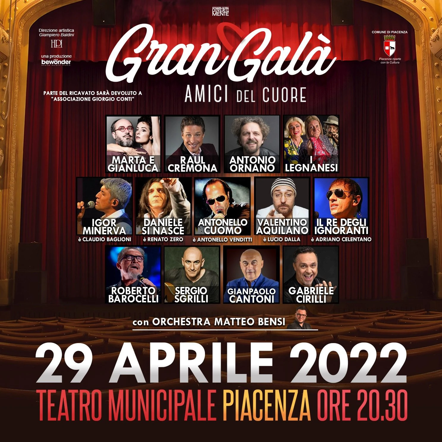 L’Associazione Culturale Divertimente, in collaborazione con il Comune di Piacenza, Hpievent e Bewonder di Andrea Baldini, è lieta di presentare l’evento benefico “Gran Galà Amici del Cuore” che si terrà al Teatro Municipale di Piacenza, Venerdì 29 Aprile 2022 alle ore 20.30.