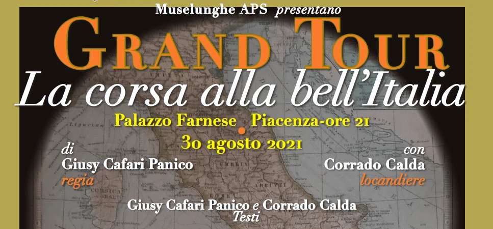 Lunedì 30 agosto 2021 alle ore 21 a Palazzo Farnese di Piacenza, per la rassegna Estate Farnese è in programma Grand Tour, la corsa alla bella Italia. Lo spettacolo di Giusy Cafari Panico vede tra i protagonisti il cantautore Morgan nei panni di Lord Byron.