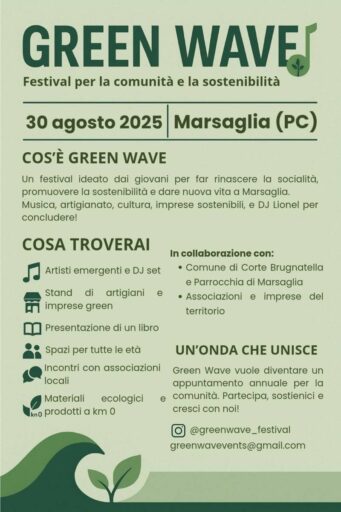 Un festival ideato per rilanciare la socialità e la sostenibilità in val Trebbia, promuovendo la collaborazione tra enti e associazioni locali e utilizzando spazi concessi dalla Chiesa e dal Comune di Corte Brugnatella. Si terrà sabato 30 agosto a Marsaglia la prima edizione di “Green Wave”, un evento finanziato dalla Fondazione di Piacenza e Vigevano nell’ambito del bando Youth bank 2025 a un gruppo di ragazzi del territorio, desiderosi di mettersi alla prova con l’organizzazione di un’iniziativa complessa, in collaborazione con Pro Loco Marsaglia e con il sostegno della cooperativa sociale Officine Gutenberg di Piacenza.