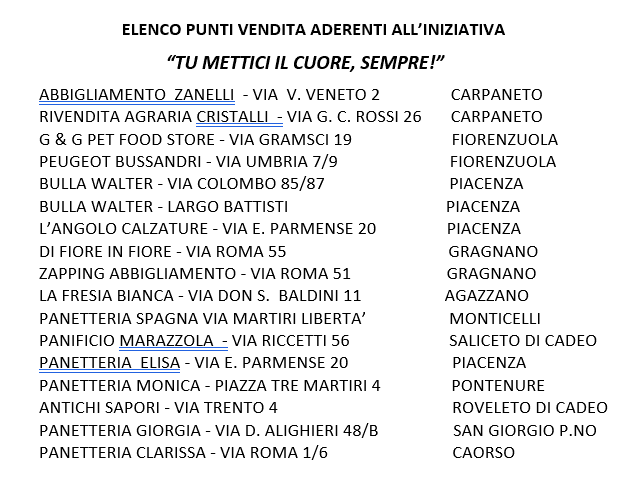 A partire da domani, martedì 2 marzo 2021 e fino a lunedì 8 marzo 2021, nei punti vendita aderenti, di seguito elencati, sarà possibile acquistare, con offerta minima, biscotti da forno a forma di cuore, prodotti dal Panificio Marazzola di Saliceto di Cadeo e dalla Panetteria Spagna di Monticelli D’Ongina dell’Associazione dei Panificatori, aderenti a Confcommercio Piacenza. Il ricavato dell’iniziativa benefica sarà devoluto all’Hospice La Casa di Iris.