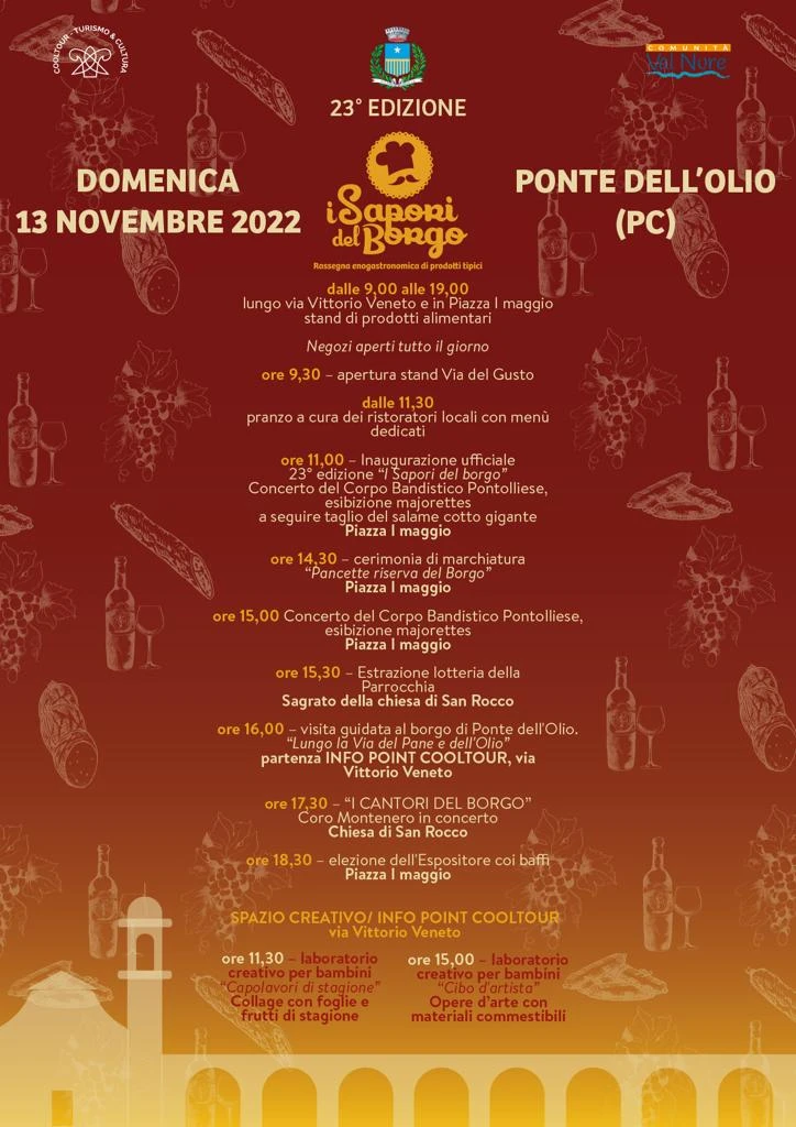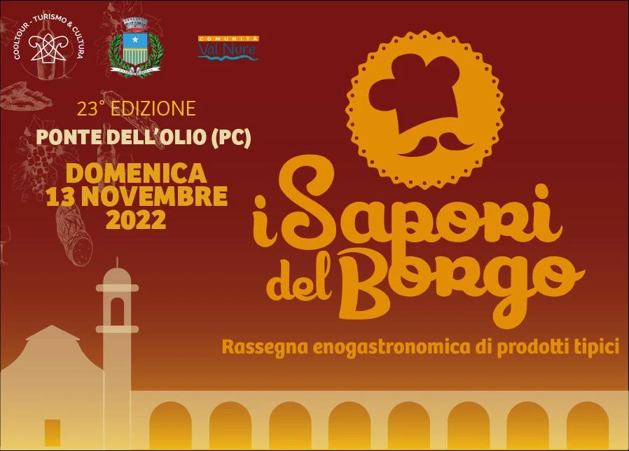 I sapori del Borgo, la via del gusto a Ponte dell’Olio. E’ in programma domenica 13 novembre 2022 dalle ore 9, la Fiera Enogastronomica con prodotti tipici.